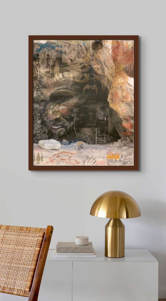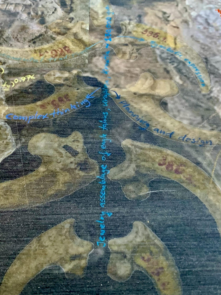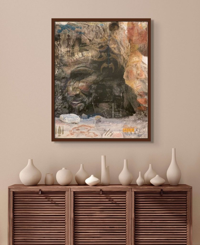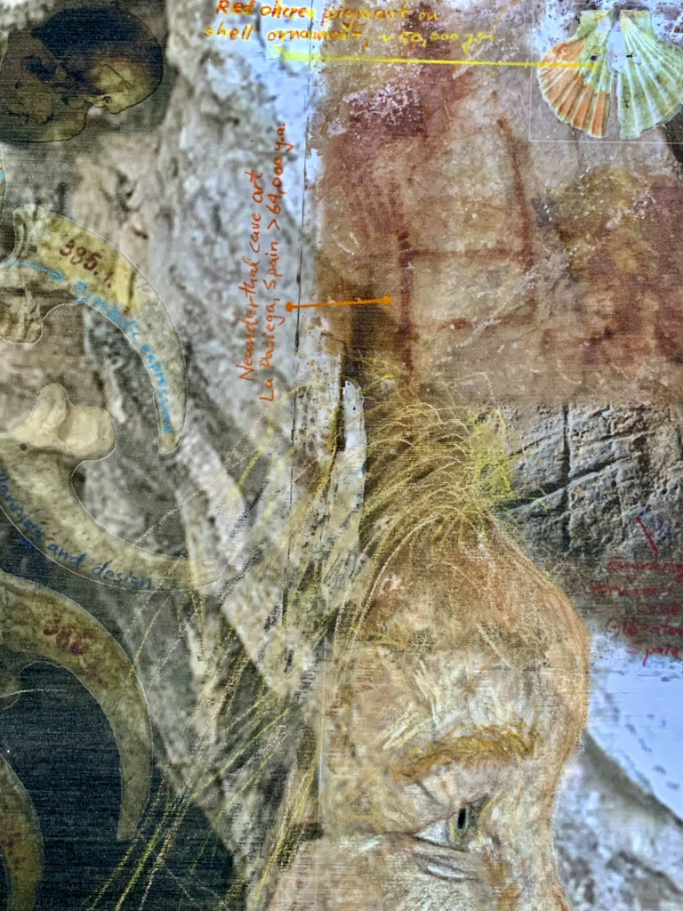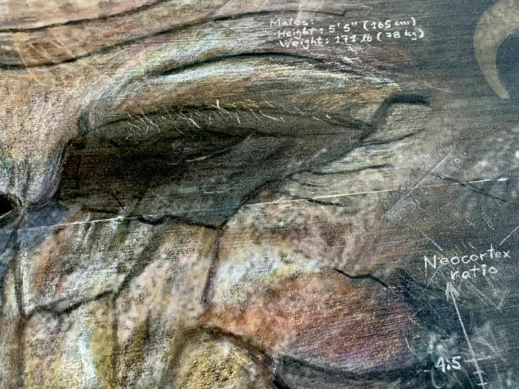 Homo neanderthalensis, were well adapted for colder climates, lived from ~400,000—30,000 years ago in smaller clans/communities across Europe and Asia. Their bodies and brains were similar in size to ours, and they made tools, weapons, and jewelry from stone, antler, bone, and teeth (“Mousterian industry”). Fossils suggest advanced language and symbolic behavior, burials, and art. Interbreeding has preserved ~20% of neanderthalhal DNA in our (Homo sapiens) genome. The artwork paints a portrait of these earlier humans by displaying scientifically derived knowledge about the era in which they existed, their place in the Homo family tree, their geographical spread and migration patterns, their facial features and physical stature, their tools, weapons, and technology, their skull and brain size, cognitive ability, culture, types of shelter, etc., and the key fossils leading to this knowledge.