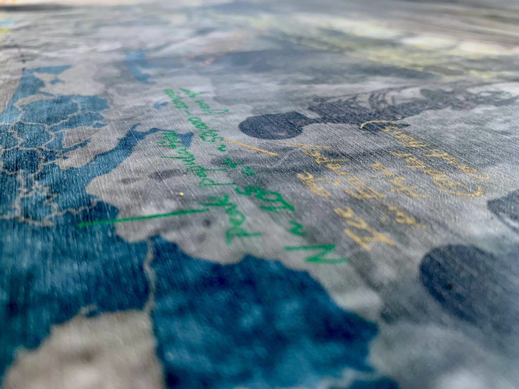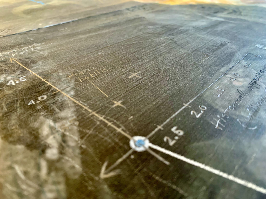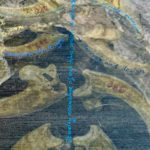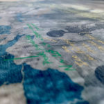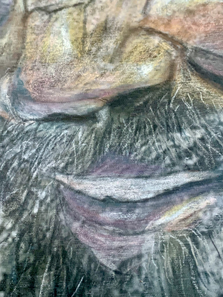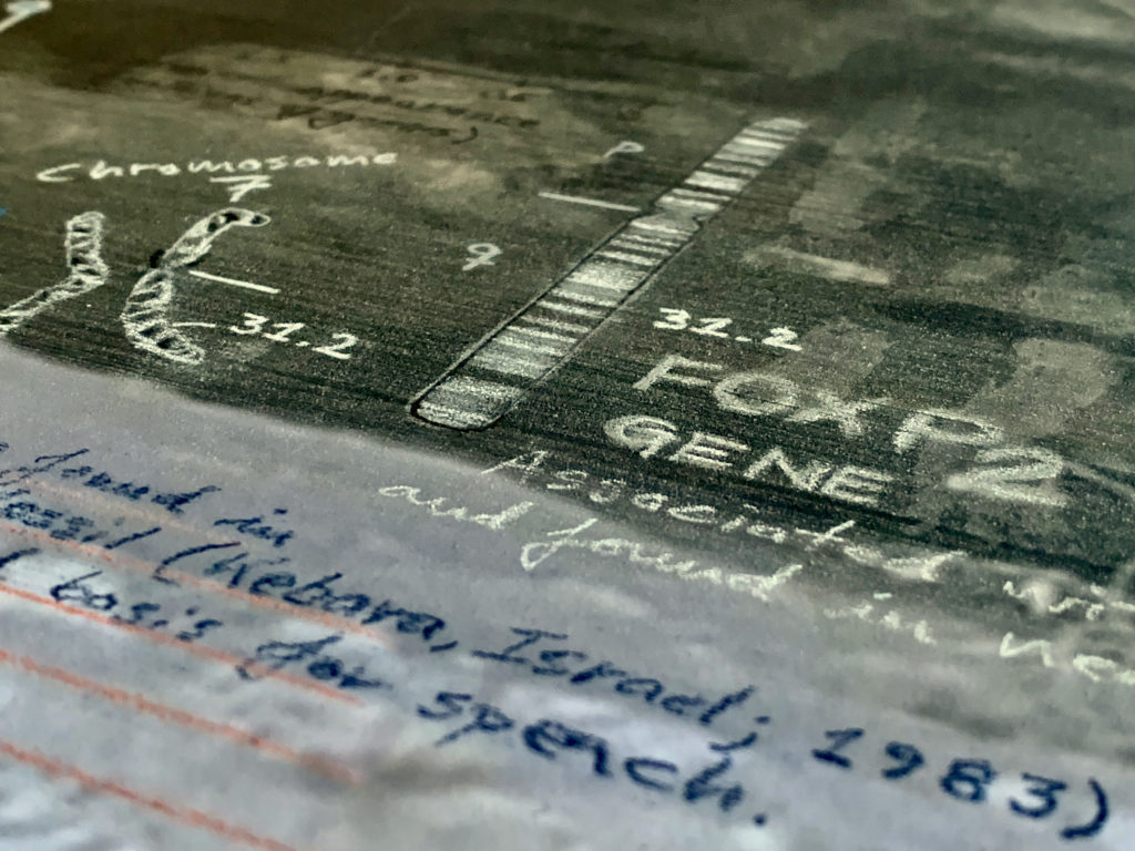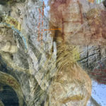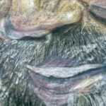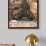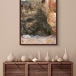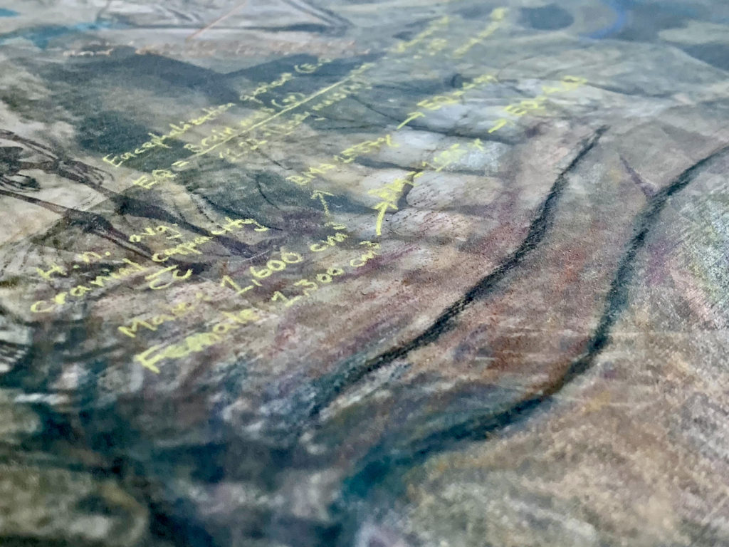Homo neanderthalensis, were well adapted for colder climates, lived from ~400,000—30,000 years ago in smaller clans/communities across Europe and Asia. Their bodies and brains were similar in size to ours, and they made tools, weapons, and jewelry from stone, antler, bone, and teeth (“Mousterian industry”). Fossils suggest advanced language and symbolic behavior, burials, and art. Interbreeding has preserved ~20% of neanderthalhal DNA in our (Homo sapiens) genome. The artwork paints a portrait of these earlier humans by displaying scientifically derived knowledge about the era in which they existed, their place in the Homo family tree, their geographical spread and migration patterns, their facial features and physical stature, their tools, weapons, and technology, their skull and brain size, cognitive ability, culture, types of shelter, etc., and the key fossils leading to this knowledge.