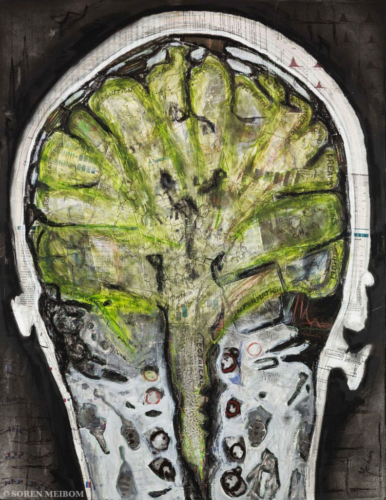 The Radiology series examines the wonders of modern medical imaging and the underlying science. The series was inspired by the dramatic, complex, and detailed pictures from inside the human body, made possible by modern radiology techniques. The individual artwork makes a connection to the object depicted by combining collage of tables, figures, and images from radiology journals, with painting and drawing, and writing of symbols, figures, mathematical and chemical formulas relevant to the imaging technique portrayed.
