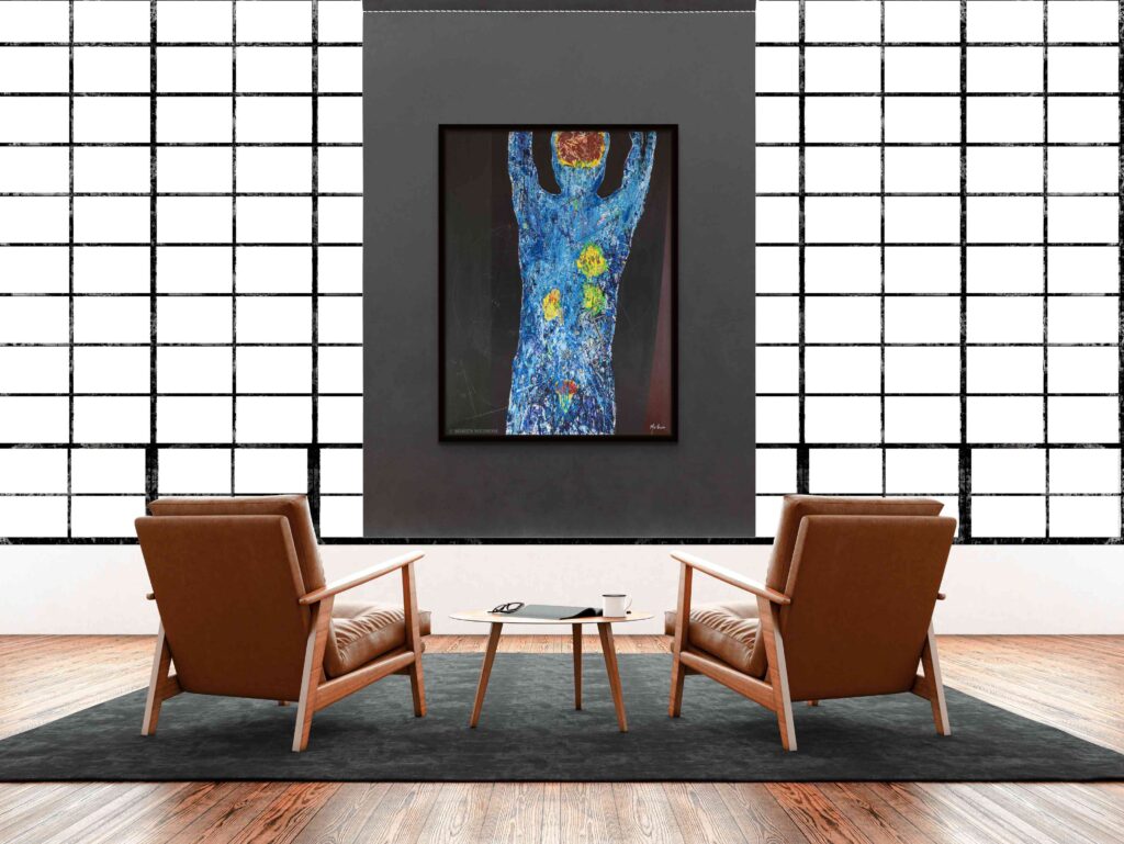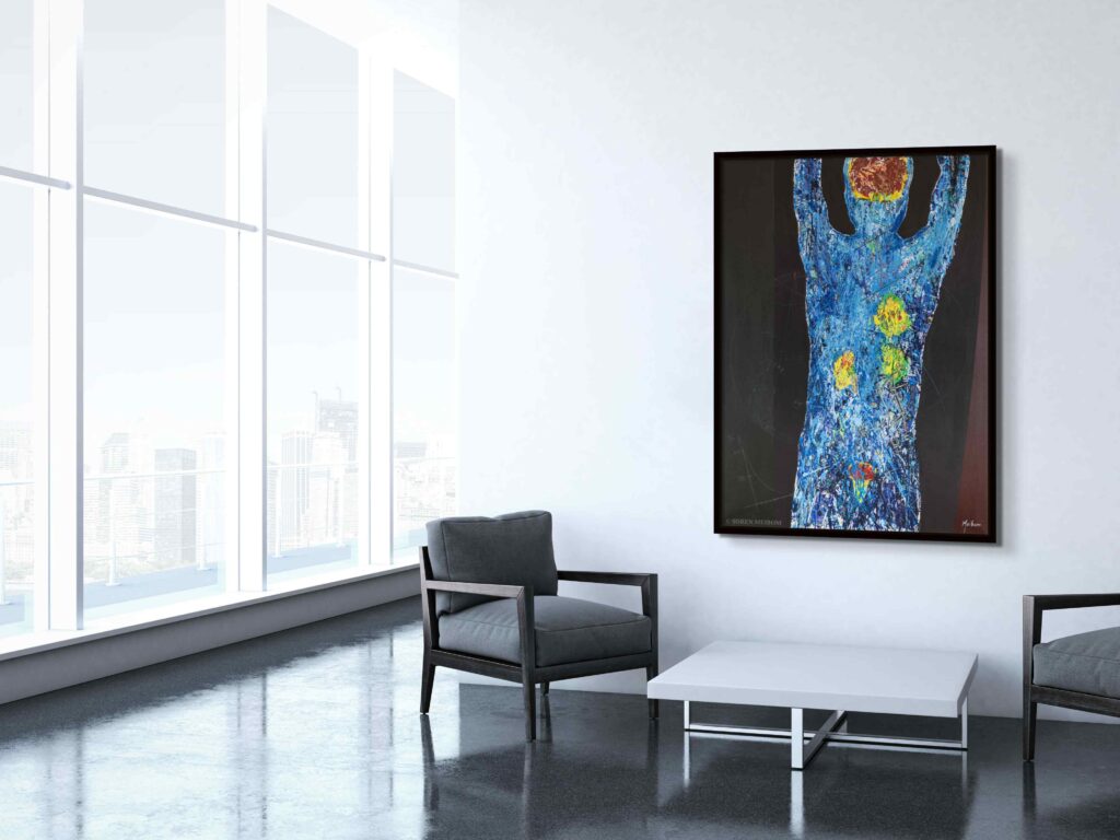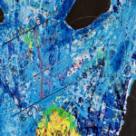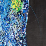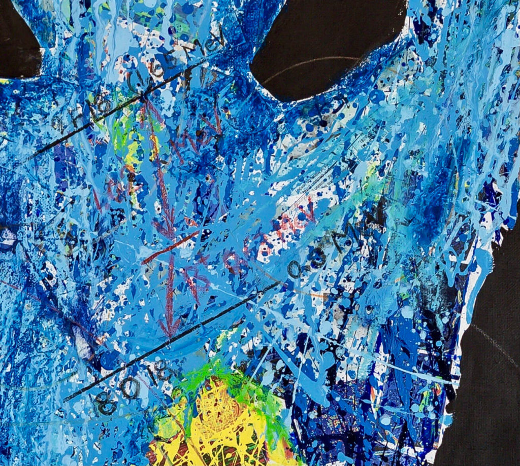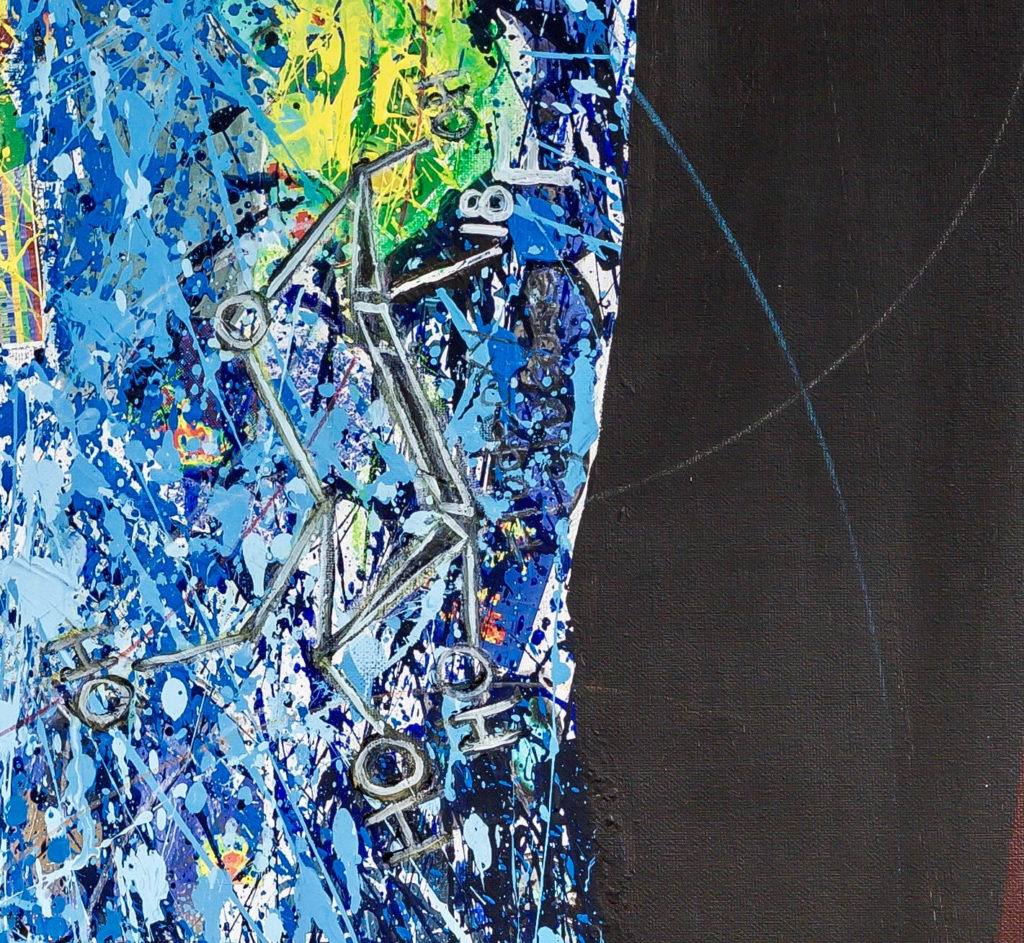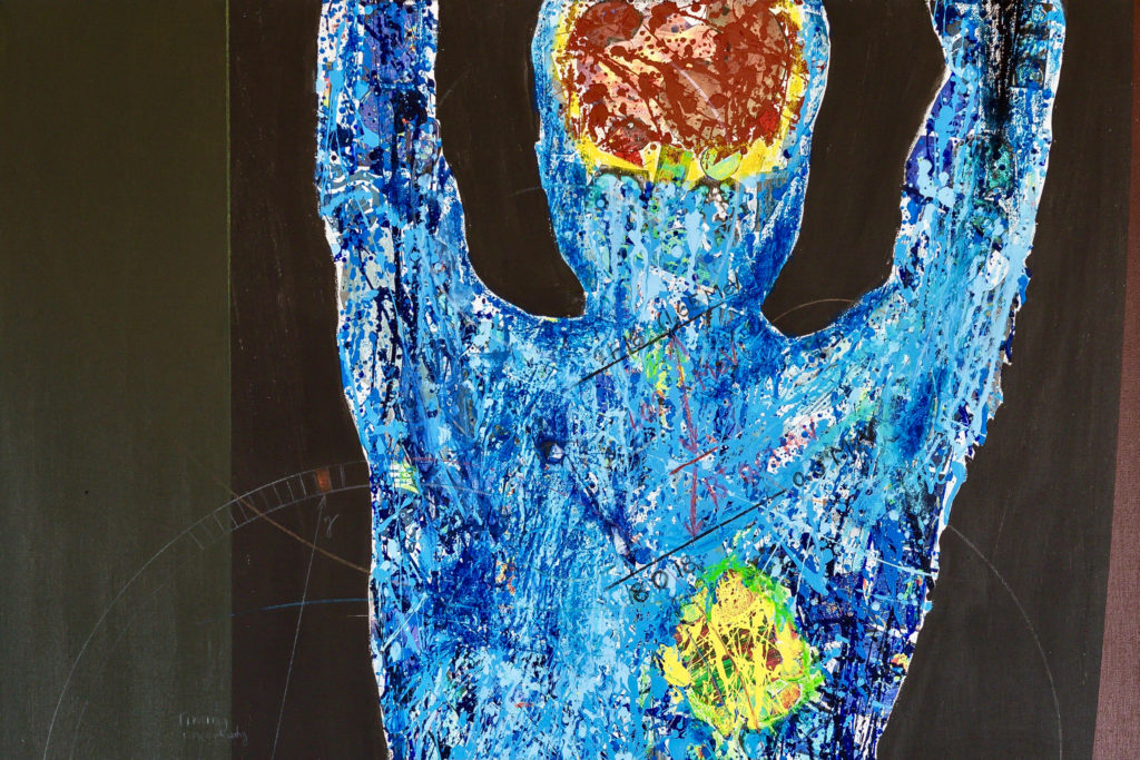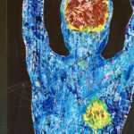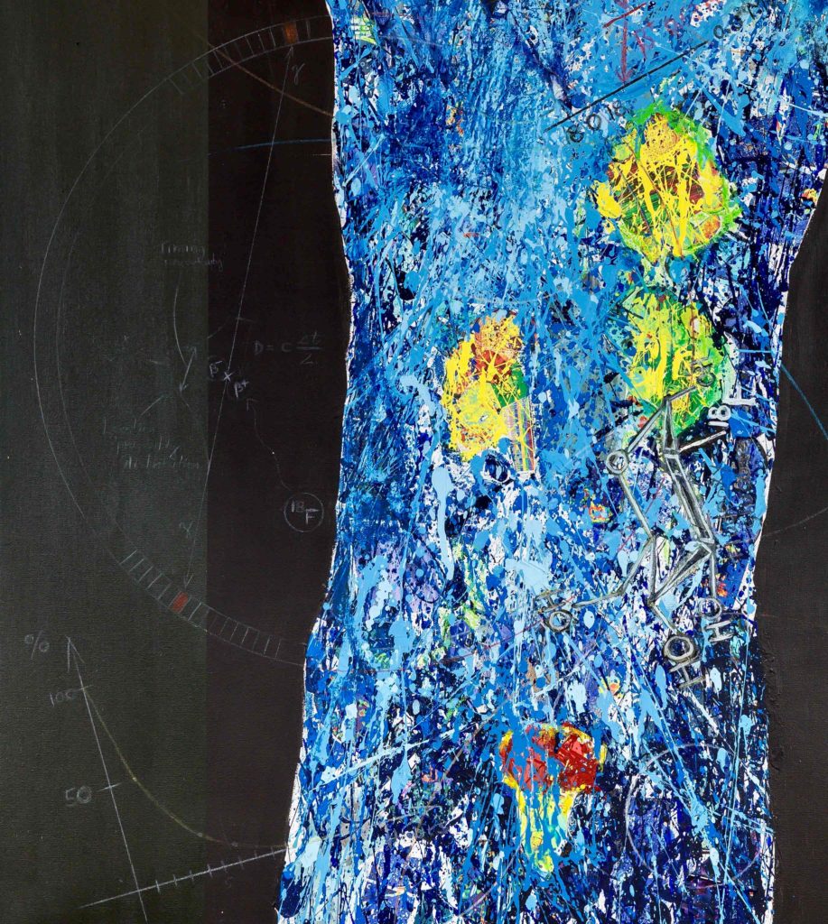 The inspiration for this piece was the Positron emission tomography (PET) imaging technique of the entire human body. The PET scan is a beautiful and powerful result of our understanding of atomic and subatomic physics. The dramatic and colorful 3D images of the human body results from unstable radioactive nuclides tracing metabolic processes. In a PET image the light comes from within the body as positrons and electron annihilate and emit gamma rays. The artwork portrays a full body PET as a collage of images from medical imaging research, with painting, sketching, and writing of symbols, figures, text. It shows the unstable radioactive fluorodeoxyglucose F18 nuclide attached to a glucose molecule and the atomic transitions that results in the emission of a positron. The image also includes a schematic of the workings of the PET camera detecting the gamma rays released when positrons and electrons interact/annihilate.