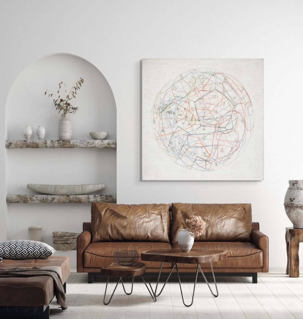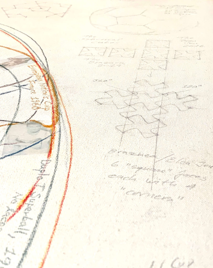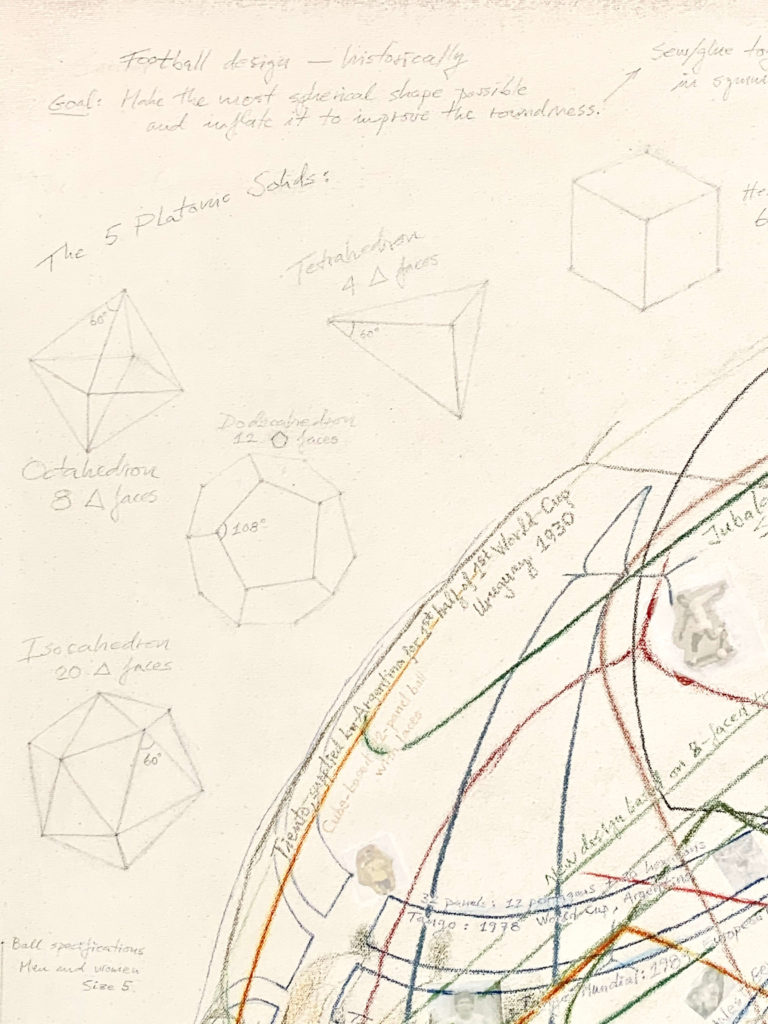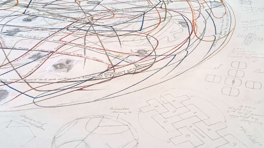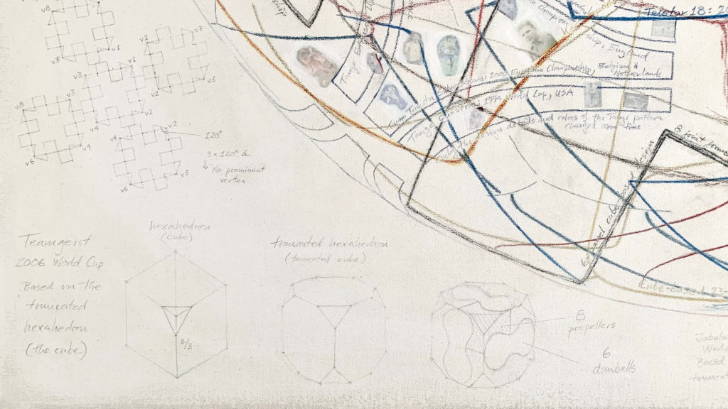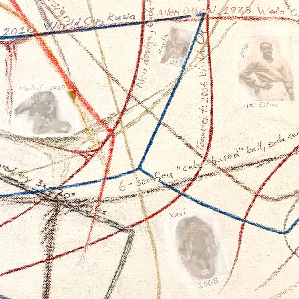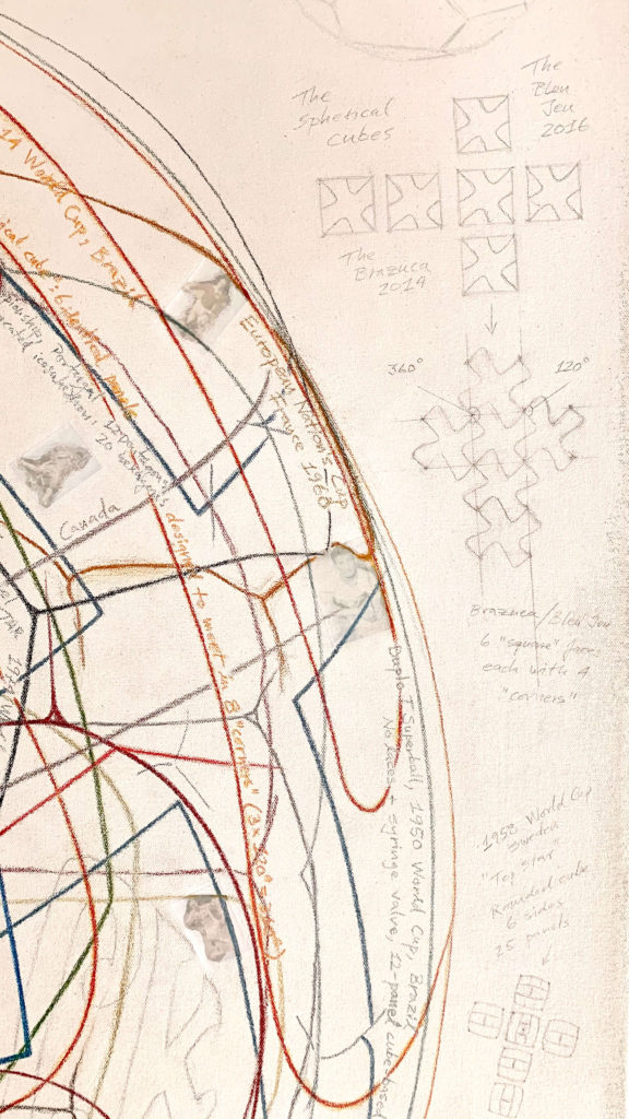 The Historical Ball displays a spherical ball-like shape, woven from the outlines of the panel-shapes and designs from and on the official World Cup and European Championships match balls from 1930–2021. The picture is a sentimental celebration of the soccer balls generations of girls and boys have played with throughout their lives, as well as a look at the fundamental mathematical geometries of convex polyhedra underlying the design and the construction of those balls. The artwork is mixed-media on canvas and measures 127cm x 127cm (50” x 50”).