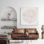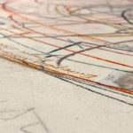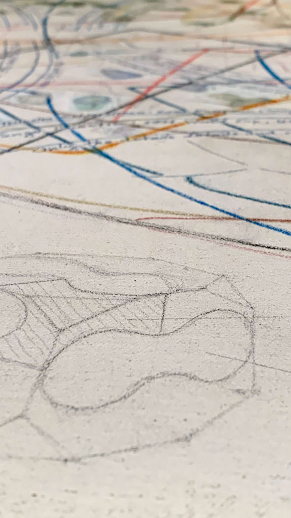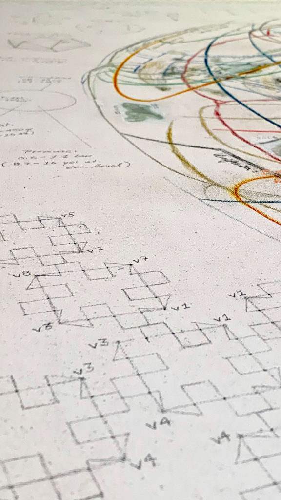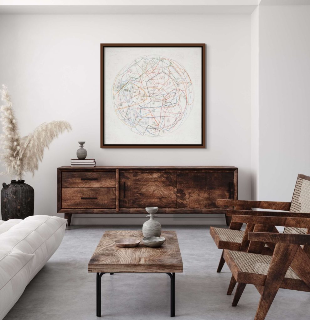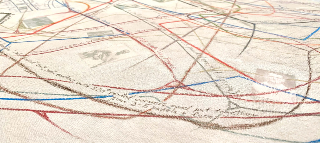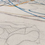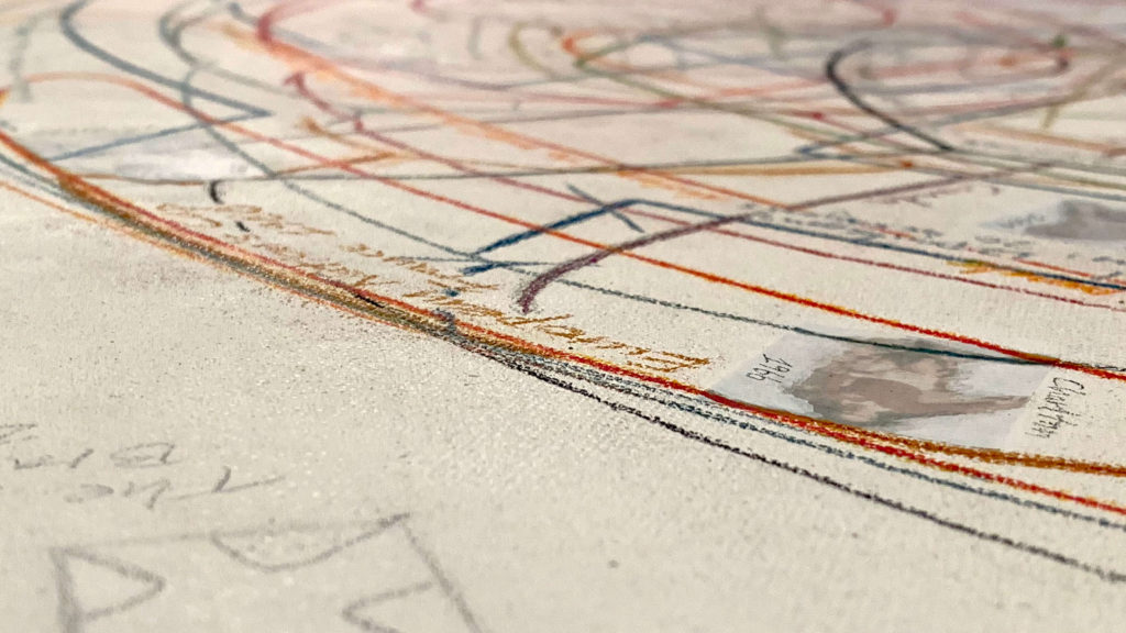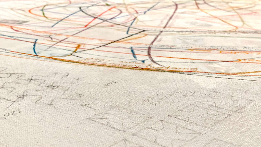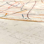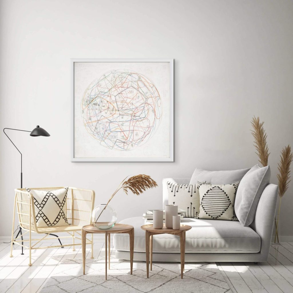 The Historical Ball displays a spherical ball-like shape, woven from the outlines of the panel-shapes and designs from and on the official World Cup and European Championships match balls from 1930–2021. The picture is a sentimental celebration of the soccer balls generations of girls and boys have played with throughout their lives, as well as a look at the fundamental mathematical geometries of convex polyhedra underlying the design and the construction of those balls. The artwork is mixed-media on canvas and measures 127cm x 127cm (50” x 50”).