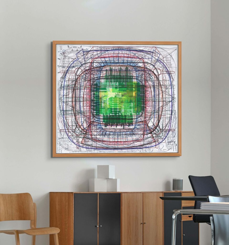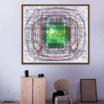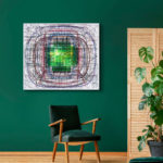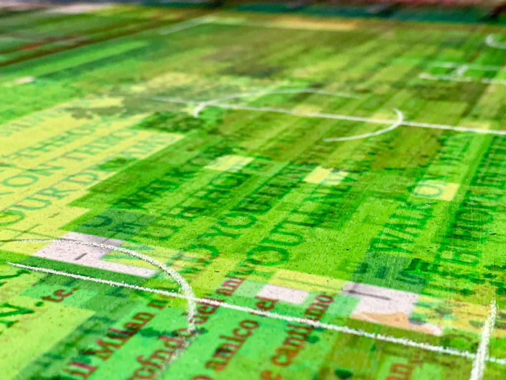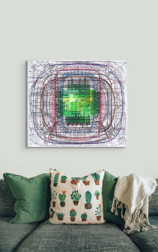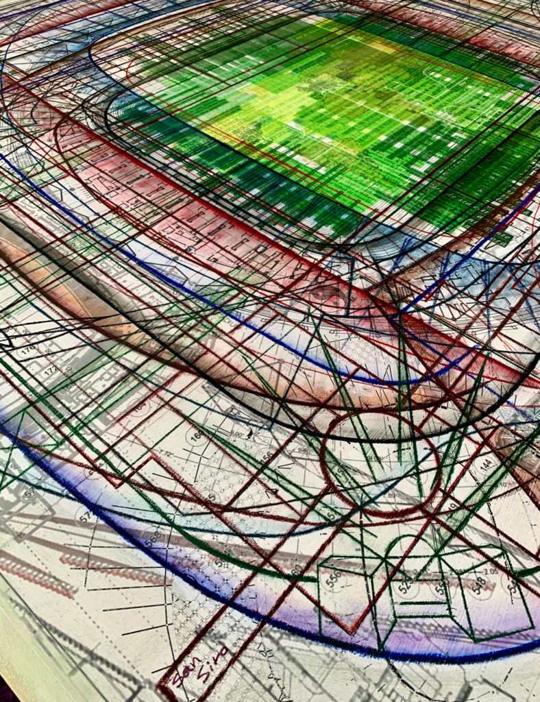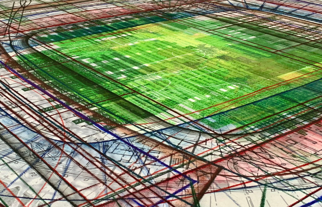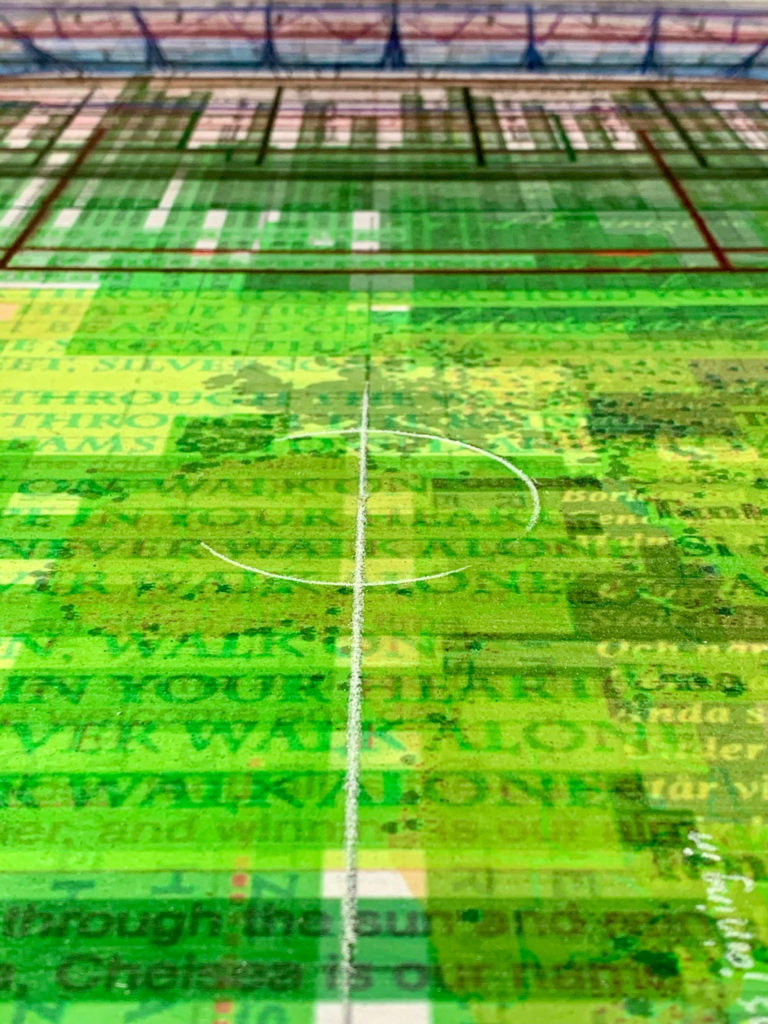 The Stadium is a second home for millions of football fans each week. It is an epicenter for human energy, nostalgia and tradition, and a refuge from everyday life where you can let limitations and logic be replaced by blind and irrational loyalty to your team. It is an open-air theater where people from all walks of life, religions, and races, stand shoulder-to- shoulder, amplifying and synchronizing their cheers and disappointment, sending waves of emotion between the stands and across the grass-green stage. The Stadium captures this energy, diversity, nostalgia and tradition by constructing a football stadium from the dramatic and beautiful architectures of legendary stadiums, and with a pitch composed of famous songs sung by fans in stadiums around the world. The artwork is mixed-media on canvas and measures 152.5cm x 132cm (60” x 52”). ©2021 Soren Meibom, all rights reserved.