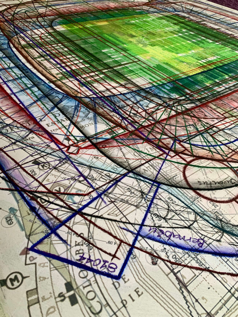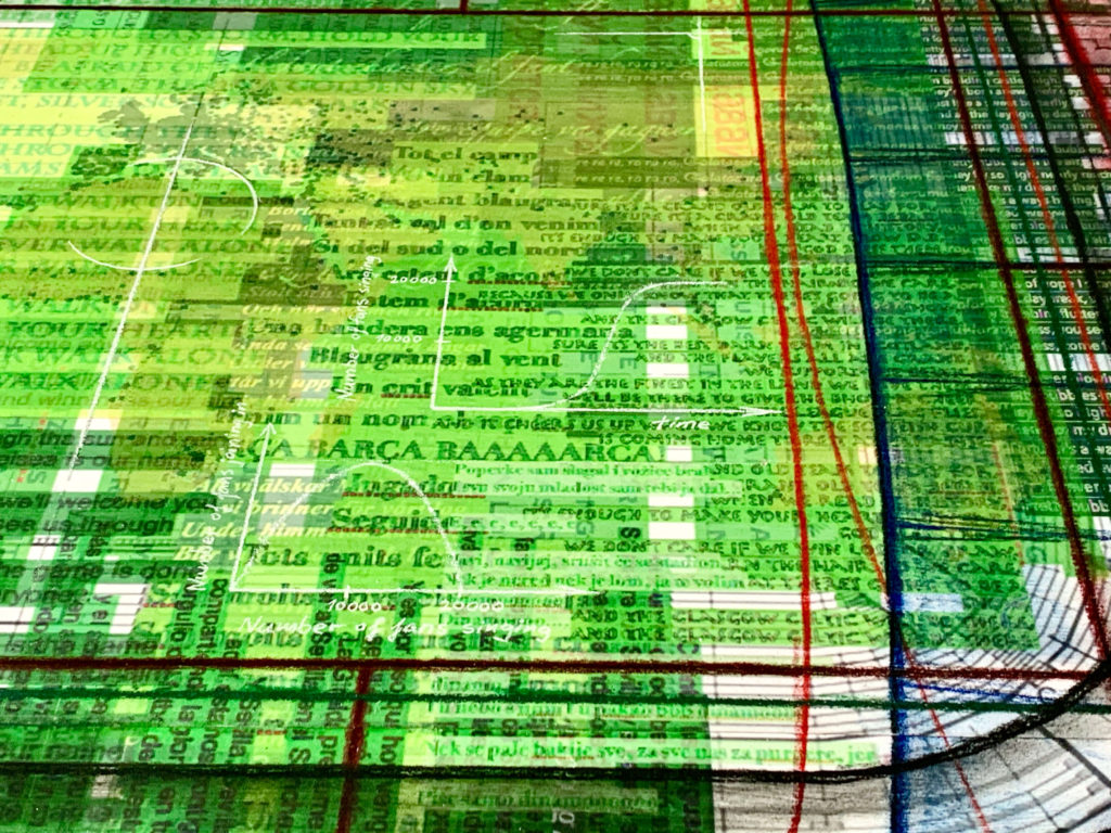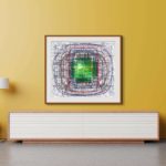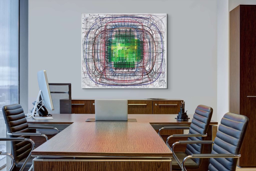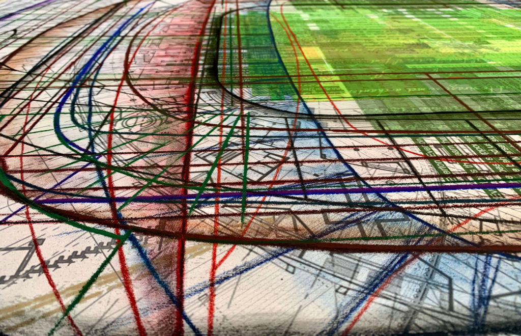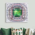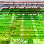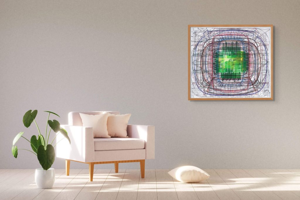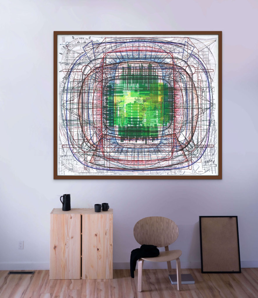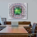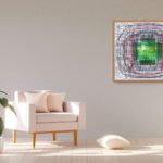 The Stadium is a second home for millions of football fans each week. It is an epicenter for human energy, nostalgia and tradition, and a refuge from everyday life where you can let limitations and logic be replaced by blind and irrational loyalty to your team. It is an open-air theater where people from all walks of life, religions, and races, stand shoulder-to- shoulder, amplifying and synchronizing their cheers and disappointment, sending waves of emotion between the stands and across the grass-green stage. The Stadium captures this energy, diversity, nostalgia and tradition by constructing a football stadium from the dramatic and beautiful architectures of legendary stadiums, and with a pitch composed of famous songs sung by fans in stadiums around the world. The artwork is mixed-media on canvas and measures 152.5cm x 132cm (60” x 52”). ©2021 Soren Meibom, all rights reserved.