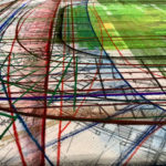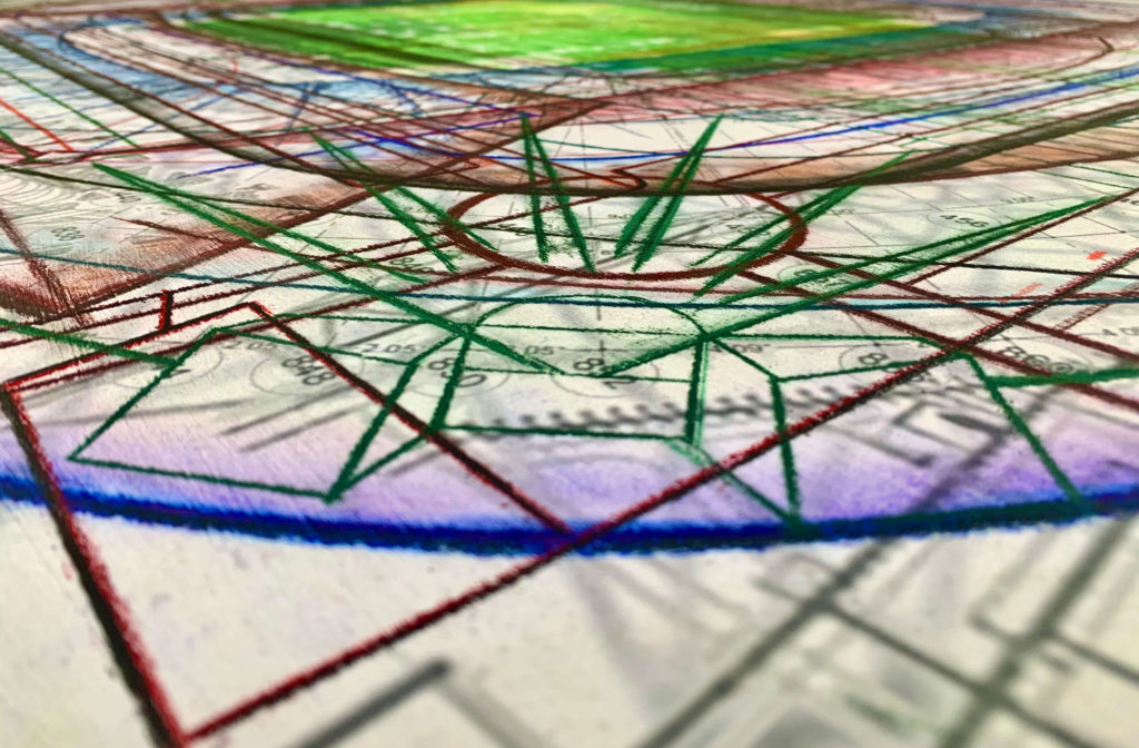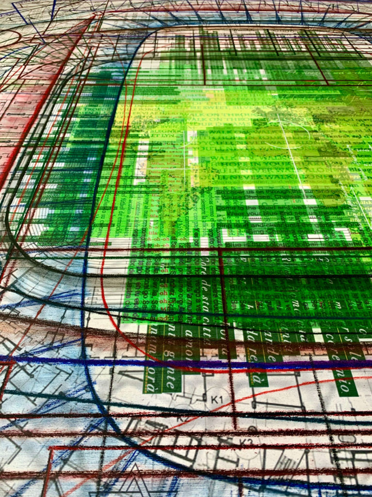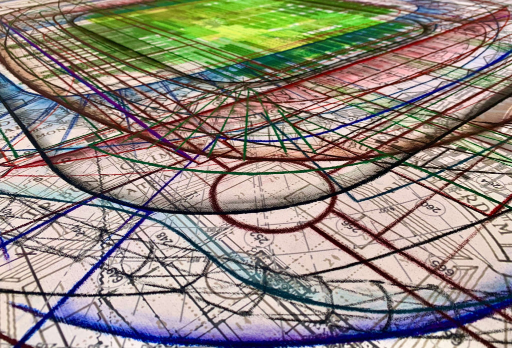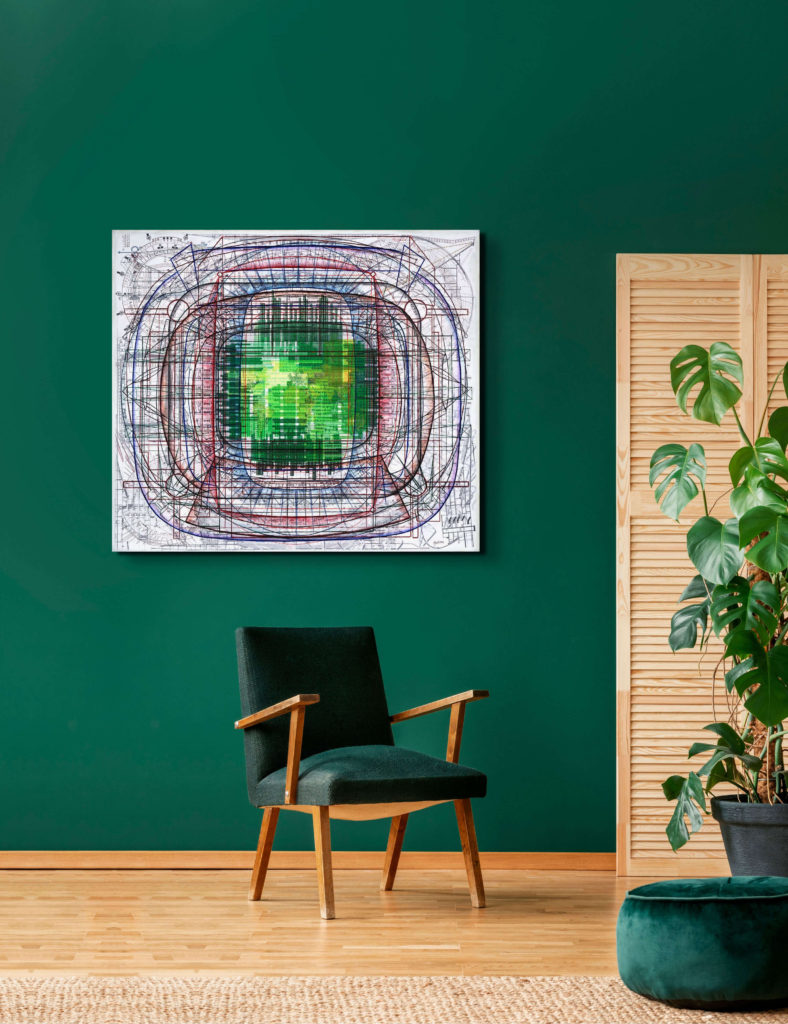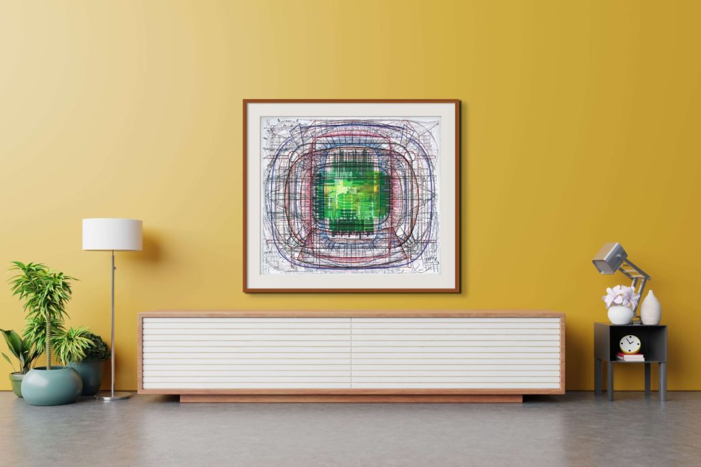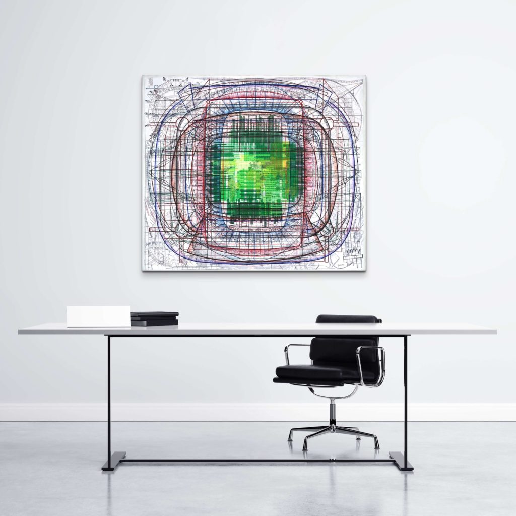 The Stadium is a second home for millions of football fans each week. It is an epicenter for human energy, nostalgia and tradition, and a refuge from everyday life where you can let limitations and logic be replaced by blind and irrational loyalty to your team. It is an open-air theater where people from all walks of life, religions, and races, stand shoulder-to- shoulder, amplifying and synchronizing their cheers and disappointment, sending waves of emotion between the stands and across the grass-green stage. The Stadium captures this energy, diversity, nostalgia and tradition by constructing a football stadium from the dramatic and beautiful architectures of legendary stadiums, and with a pitch composed of famous songs sung by fans in stadiums around the world. The artwork is mixed-media on canvas and measures 152.5cm x 132cm (60” x 52”). ©2021 Soren Meibom, all rights reserved.